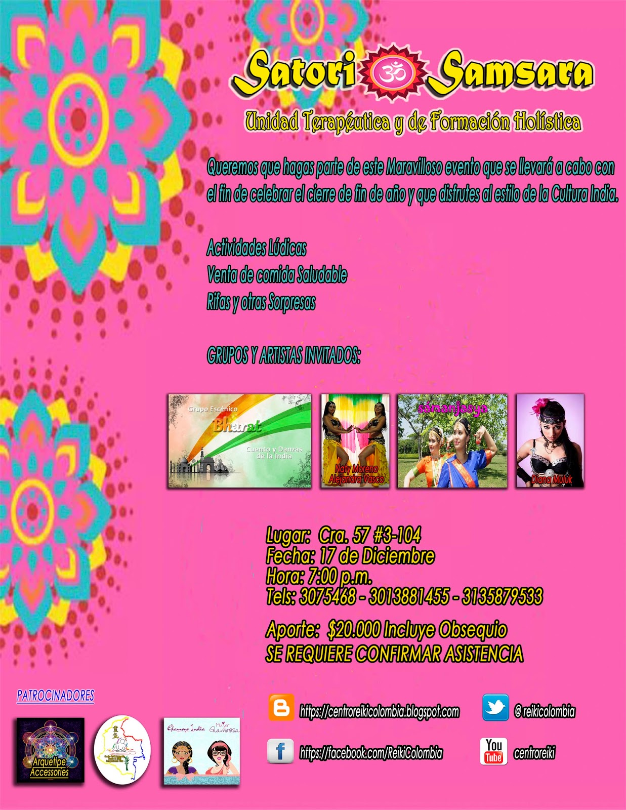 Gracias Satori Samsara Reiki de Colombia. Por permitir a Mujer Glamorosa y su equipo se Patrocinadora de este Maravilloso evento de cierre de fin de año. Una muestra cultural de la India donde observamos un gran profesionalismo en las academias invitadas. Compartimos momentos de Amistad y entrega. Los esperamos el próximo año en el centro Satori Samsara para que nos permitas seguir acompañándote en Tu crecimiento Interno.